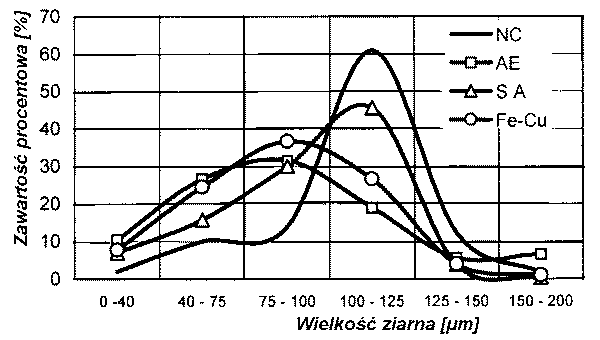 Przedstawione na RYSUNKU 1 krzywe rozkładu granulometrycznego proszków żelaza wskazują na większy rozrzut wymiarów ziaren dla napełniaczy oznaczonych symbolami AE, SA i FeCu a maksimum zawartości w przypadku proszków FeCu i AE przypada na rozmiary ziarna od 50-100 (im. Dla proszku SA maksimum zawartości przypada na ziarna o wymiarze 100 µm podobnie jak dla proszku NC, jednak posiada on znacznie większy udział procentowy cząstek o rozmiarach poniżej 70 µm oraz minimalną, ok. 1% zawartość cząstek powyżej 125 µm. Większy rozrzut ziarnowy cząstek napełniaczy, a szczególnie duża zawartość cząstek o małych wymiarach powinien wpłynąć korzystnie na cechy użytkowe kompozytów.