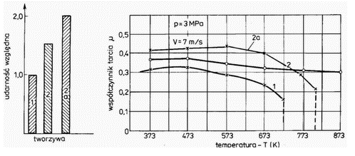 - Rys. 2. Zależność współczynnika tarcia od temperatury oraz zużycie względne tworzyw: