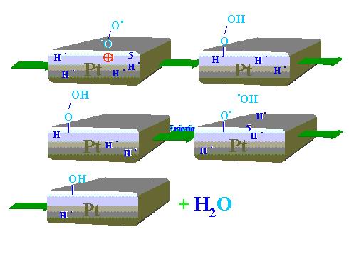 molecule (O2) to produce radical-negative-ion (•O-O-). Then, as Figure 14 shows, the generated radical-anion reactive species looks for adequate positively charged site on the platinum surface where hydrogen radicals are available. Such interaction results in the formation of platinum bonded peroxyhydroxide. Peroxides are known to be very unstable due to the weak oxygen-oxygen bonding. Decomposition of the peroxide leads to generation of hydroxy-radical (HO•) just in the place where hydrogen free radicals are evolved (H•). Recombination of the two radical types produce water molecules.