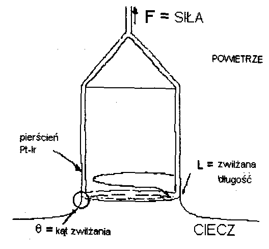 Badania napięcia powierzchniowego wykonano za pomocą tensjometru K100 firmy Kruss. Wartość napięcia powierzchniowego i międzyfazowego za pomocą tensjometru K100 wyznacza się przy użyciu najlepiej zwilżalnych elementów pomiarowych zawieszonych na bardzo precyzyjnym układzie wagowym. Elementami pomiarowymi są pierścień lub płytka. W pracy używano metody opartej na zastosowaniu pierścienia. Zasadę pomiaru i wyznaczania poszczególnych wartości wielkości fizycznych niezbędnych do obliczenia napięcia powierzchniowego przy użyciu pierścienia obrazuje rys. 2.