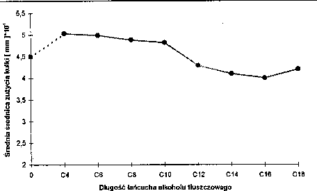 RYS. 2 przedstawia zależność średnicy zużycia kulki od długości łańcucha alkoholu w stężeniu 0.1 % (m/m) w n-heksadekanie. Badano tylko alkohole o parzystej liczbie atomów węgla. Wynika to z faktu, że są one łatwiej dostępne.