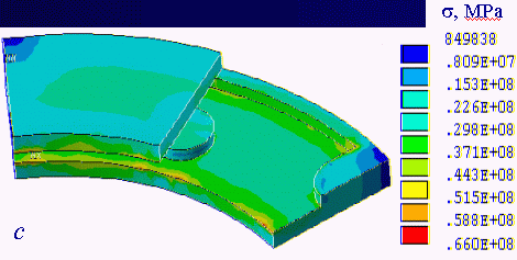 Mises distribution of equivalent stresses over outer contact and inner surface of the friction lining conjugated with the metal backing for the basic and optimized designs | |