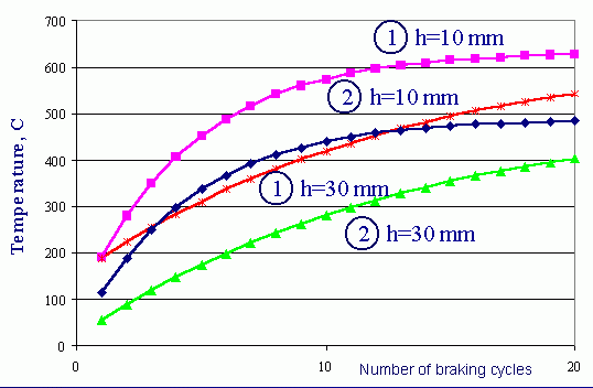 Temperature dependence on the frictional lining surface upon number of brakings