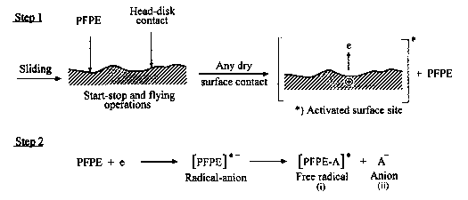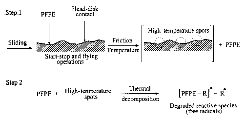 Most recent high-vacuum test results (Zhao and Bhushan, 1999) demonstrate that the degradation process of the 1.5-nm-thick Z-DOL lubricant film generates CFO, HCF2, and CF species during sliding. CF2O