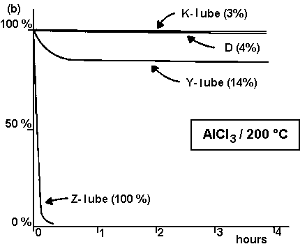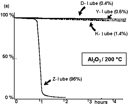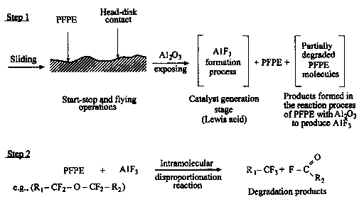 The result of this comparison was concluded as follows: "What is most significantly revealed here is that the lubricant degradation in the disk environment is also singularly dominated by the Lewis acid catalyzed disproportionation reaction, and no other reaction of consequence is operative" (Kasai, 1999). Although the considered similarities are very interesting and might provide some evidence for the