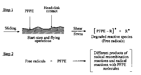 decrease in friction (Hirz et al., 1992). Under operating conditions, the removal of PFPE lubricant molecules from sliding and flying tracks, comprises its displacement and loss. The removal rate depends on film thickness, chemical structure, and molecular weight. Microscale friction and properties of molecularly thin liquid films most recently were discussed in detail by Bhushan (1999b). In flying and sliding, the lubricant removal rate from monolayer films is significantly slower than from multilayer films (Novotny and Baldwinson, 1991). The lubricant loss in sliding can be due to polymer scission (Buchholz and Wilson, 1986). Direct mechanical scission at shear rates of 108-1010 s -1; is possible (Novotny and Baldwinson, 1991; Bhushan, 1999b); however, other factors can contribute to the lubricant degradation as well. Mechanical scission of PFPE bonds leads to the formation of free radicals, similarly as in the thermal degradation process. Figure 16 provides a schematic presentation of the PFPE degradation process caused by high shear stresses.
