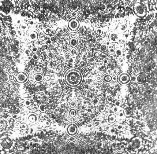 Na rys. 3.18 przedstawiono obraz uzyskany za pomocą polowego mikroskopu jonowego dla ostrza platynowo-irydowego. Przy takim wielkim powiększeniu ostre ostrze okazało się półkulą, która przecina płaszczyzny metalograficzne metalu, tworząc układ okrągłych krystalicznych ścianek.