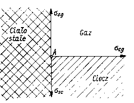 Jeżeli ciecz znajduje się w naczyniu, możemy wtedy wyróżnić powierzchnie rozdziału faz: ciało stałe-gaz, ciecz-gaz i ciało stałe-ciecz. Między tymi fazami występują napięcia powierzchniowe, tj. między ciałem stałym a gazem ssg, między cieczą a gazem scg i między ciałem stałym a cieczą ssc. Początkowy kierunek sił napięcia powierzchniowego działających na cząstkę A przedstawiono na rys. 3.19.