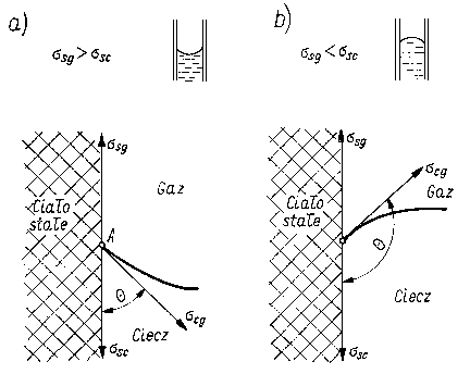 Rys. 3.20. Powierzchnie rozdziału tworzą menisk wklęsły lub wypukły w zależności od różnicy napięć faz badanych ciał: