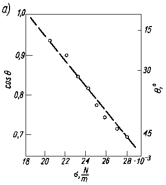 Jak wykazały badania eksperymentalne, między kątem zwilżania a napięciem powierzchniowym istnieje prostoliniowa zależność (rys. 3.22a). W przypadku, gdy zwilża się jedną powierzchnię cieczami należącymi do jednego szeregu homologicznego, zależność ta jest bardzo ścisła, natomiast w przypadku różnych powierzchni i różnych cieczy poszczególne wartości układają się w pasie o określonej szerokości (rys. 3.22b).