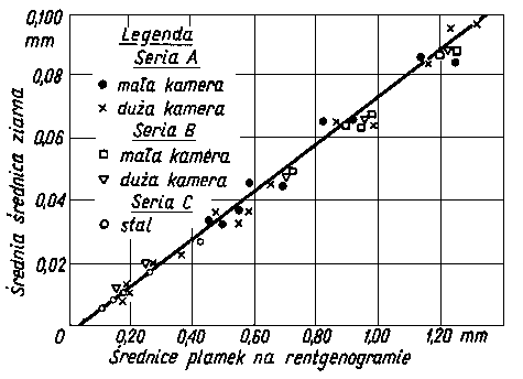 Rys. 3.39. Zależność pomiędzy wymiarami plam dyfrakcyjnych a średnią średnicą ziarna
