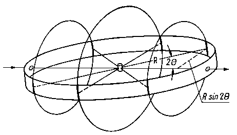 Ugięta wiązka promieni rentgenowskich tworzy stożek wokół osi, którą jest wiązka pierwotna. Kąt rozwarcia stożka wynosi 2Q. Połowa kąta rozwarcia stożka ma dla każdej płaszczyzny sieciowej wartość d dlatego powstaje kilka stożków interferencyjnych. Jeśli na drodze promieni ugiętych ustawi się prostopadle do nich błonę filmową, wówczas jako ślady przecięcia tych promieni z płaszczyzną powstają pierścienie Debye'a-Scherrera (rys. 3.40).