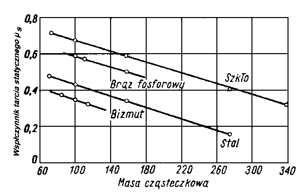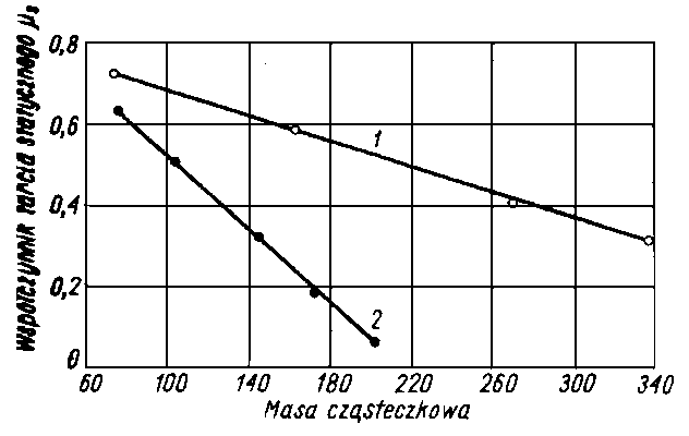 Jak wynika z wykresów, substancje zdolne do chemisorpcji powodują zasadnicze zwiększenie wartości współczynnika tarcia, pomimo że lepkość pozostaje praktycznie nie zmieniona. Oprócz substancji zdolnych do chemisorpcji wprowadzono również do oleju bazowego P-5 olej mineralny o różnym stopniu znitrowania. Przy niskim stopniu znitrowania (równoznaczne z niewielkim momentem dipolowym) wartość współczynnika tarcia zmniejszała się, a przy wysokim stopniu znitrowania (wysoki moment dipolowy) następował wzrost wartości współczynnika tarcia. Olej bazowy czysty miał mniejszą smarność niż ten sam olej z dodatkami smarnościowymi. Należy więc odrzucić klasyczną definicję smarności, jako niezgodną z wynikami badań.
