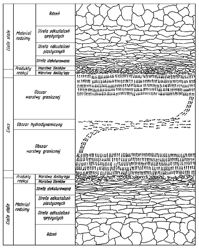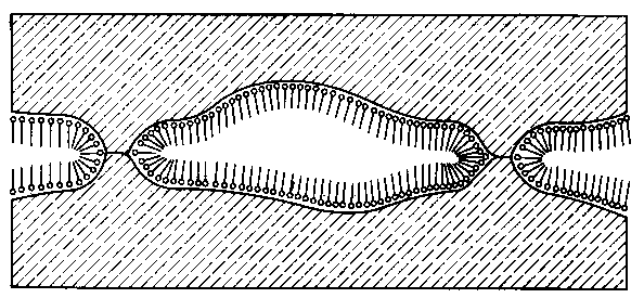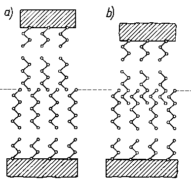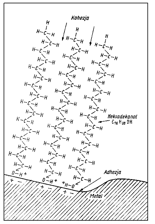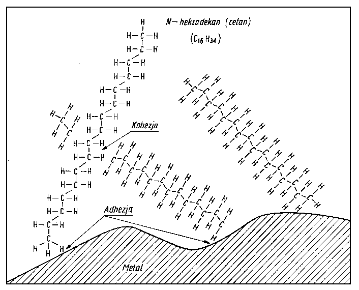 A. Wachal dokonał analizy poglądów różnych autorów dotyczącej zjawiska smarności (69) stwierdzając, że istnieje ogromne zróżnicowanie w tym zakresie. Tak na przykład wielu autorów uważa, że oprócz zmniejszenia wartości współczynnika tarcia przy smarowaniu granicznym smarność polepsza się wraz ze zwiększeniem zwilżalności metalu przez olej. Uzależnia się ją również od wartości napięcia powierzchniowego na granicy faz olej-metal lub olej-powietrze oraz od kąta zwilżenia metalu przez olej. Niektórzy autorzy uważają, że smarnością odznaczają się wyłącznie takie substancje, które zwilżają daną powierzchnię i że smarność jest ściśle uzależniona od wartości napięcia powierzchniowego. Dlatego też staje się zrozumiałe to, że zjawiska napięcia powierzchniowego (70) uważano za główną przyczynę występowania własności smarnych cieczy. Nie ulega wątpliwości, że zjawisko kapilarności, a głównie kształt menisku, jest jednym z głównych parametrów efektu zwilżania, gdyż siły kapilarne pozwalają substancji smarującej przenikać w największe nierówności między stykającymi się powierzchniami.