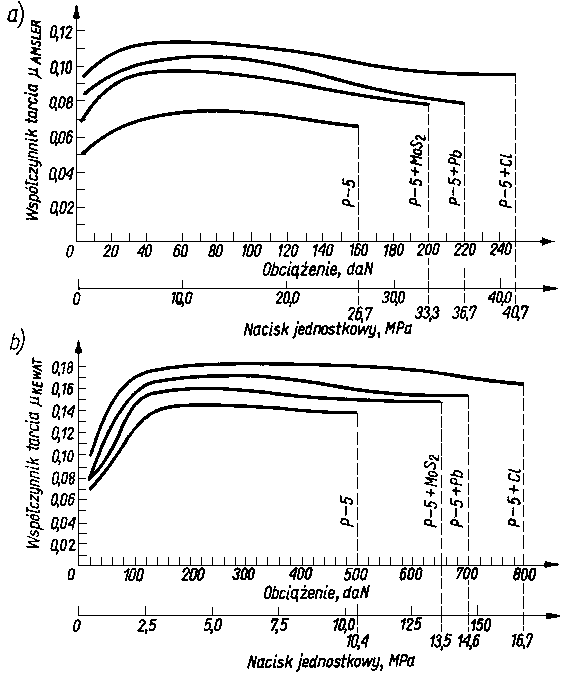W badaniach sprawdzających (81) stosowano olej P-4 (frakcja z destylacji próżniowej). Do tego oleju wprowadzono jako dodatki polarne zdolne do adsorpcji, ewentualnie do chemisorpcji, czyste związki (alkohol cetylowy CH3(CH2)14CH2OH, kwas palmitynowy CH3(CH2)14COOH i siarka) oraz dodatki handlowe Acorox 88 (dwualkilodwutiofosforan cynku, 50-proc. roztwór w oleju mineralnym), chlorowaną parafinę (ok. 26 atomów węgla i 40% Cl), nitrowany olej parafinowy oraz Dysperbar K (nitrowany Dysperbar 1000-sól barowa kwasów naftosulfonowych).