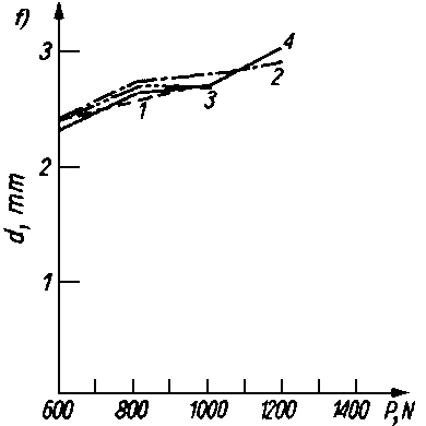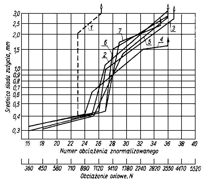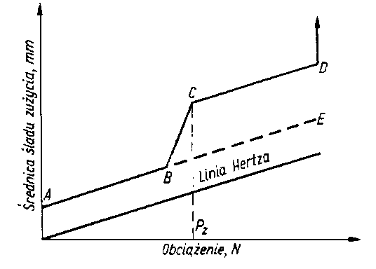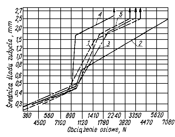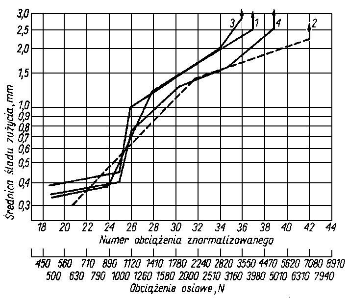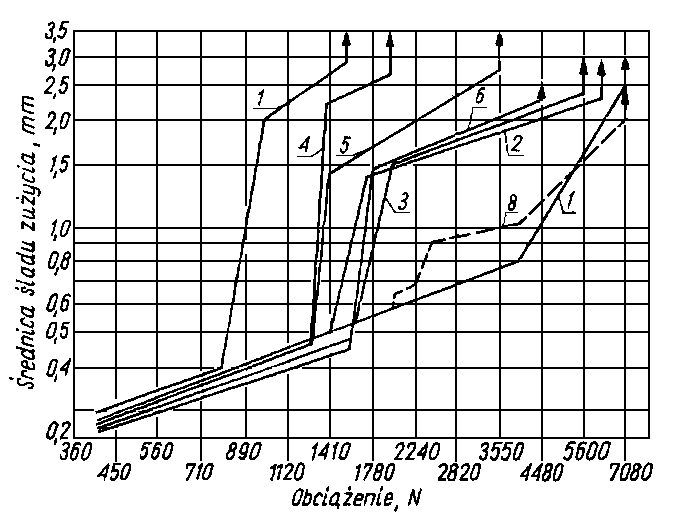 Rys. 5.75. Zależność zużycia od obciążenia dla oleju z dodatkami (5% mas.) związków chlorowych (wg Winogradowej);
