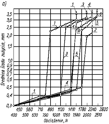 Rys. 5.72.Zależność zużycia od obciążenia dla oleju z dodatkami estrów tiowęglowego (we Winogradowej);