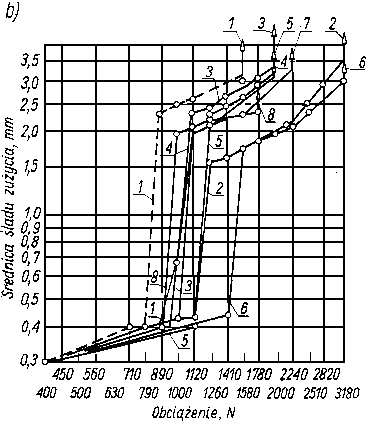 Rys. 5.73.Zależność zużycia od obciążenia dla oleju z dodatkami dwutioltionów (wg Winogradowej);