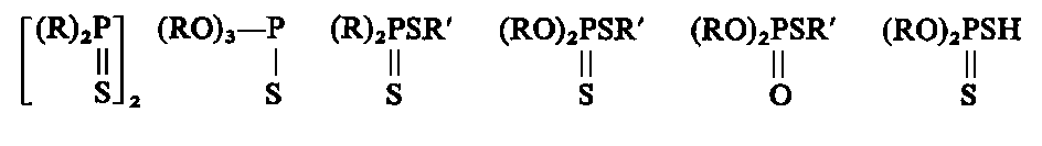 - Osobną grupę stanowią trójtiowęglany organiczne bardzo rozpowszechnione w krajach zachodnich, dobrze rozpuszczalne w olejach, przejawiające ponadto działanie przeciwutleniające i przeciwkorozyjne. W przypadku ograniczonej rozpuszczalności związku w oleju, zwiększenie rozpuszczalności osiąga się poprzez wprowadzenie atomów chloru do cząsteczki. Poniżej przedstawiono kilka przykładów trójtiowęglanów