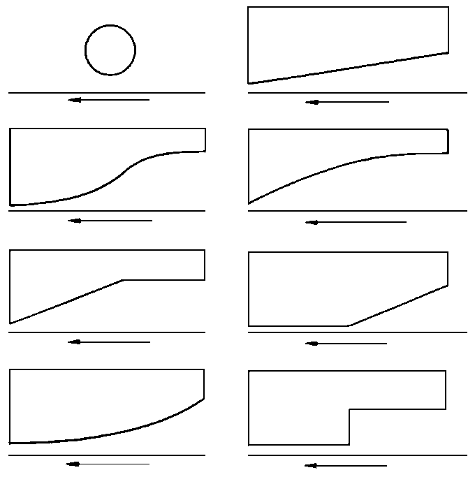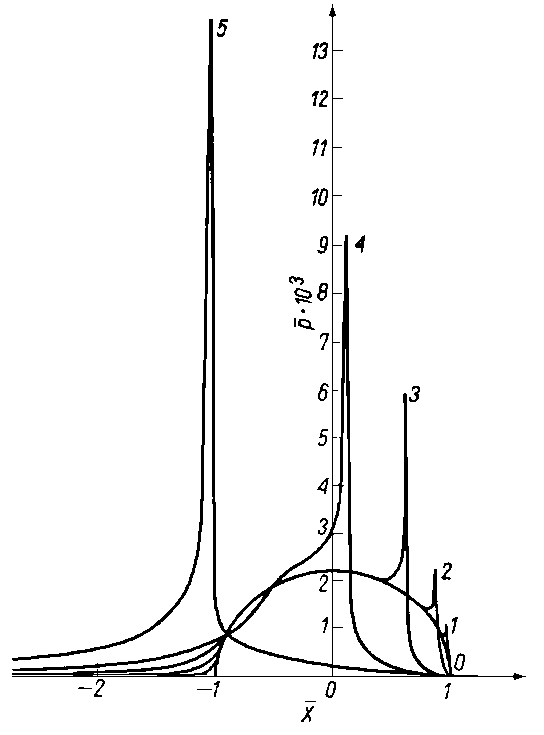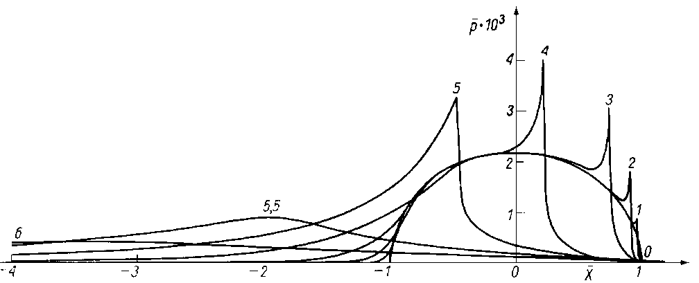 Porównanie rys. 6.101 i 6.104 wykazuje, że we wszystkich przypadkach uwzględniających ściśliwość wartość ciśnienia szczytowego zmniejsza się i przesuwa w kierunku +x. Zmniejszenie to jest szczególnie wyraźne przy dużych wartościach parametru prędkości.