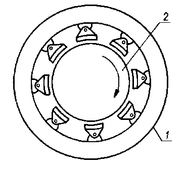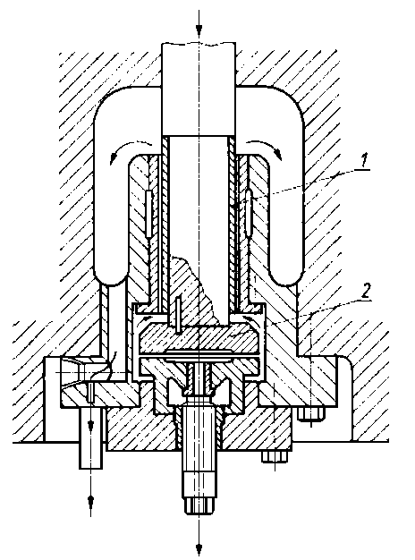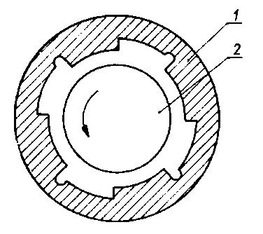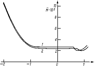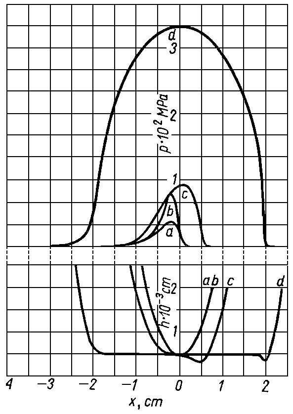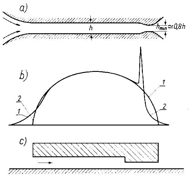 Uwzględnienie ściśliwości cieczy nie wpływa zasadniczo na kształt warstwy smarującej. Na rys. 6.105 przedstawiono kształt warstwy elastohydrodynamicznej dla cieczy nieściśliwej 1 oraz dla cieczy ściśliwej 2.