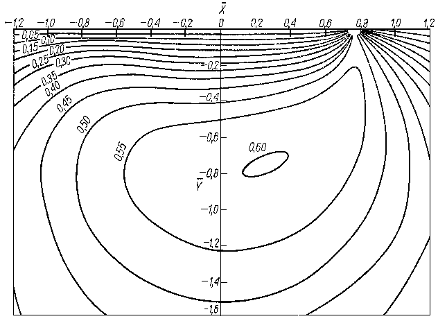 Rozkład naprężeń w ciele stałym powstający w warunkach smarowania styku Hertza przedstawiono na rys. 6.107. Krzywe podane na tym rysunku odpowiadają jednakowym wartościom stosunku maksymalnych naprężeń głównych do maksymalnych naprężeń Hertza. Rozkład ten dotyczy czystego toczenia, a niesymetria rozkładu naprężeń względem osi V jest wywołana istnieniem rozkładu ciśnienia dynamicznego w cieczy.