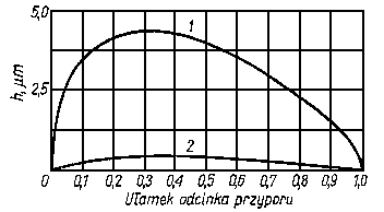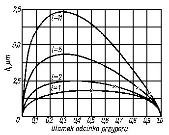 Rys. 6.109. Zmiana grubości h warstwy smarującej wzdłuż odcinka przyporu;