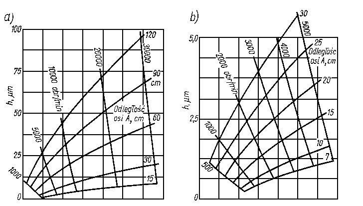 Rys. 6.111. Zależność grubości h warstwy elastohydrodynamicznej na kole podziałowym od prędkości obrotowej nwiększego koła przekładni zębatej oraz od odległości między osiami kół zębatych