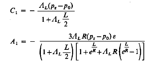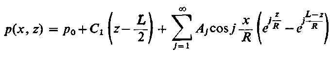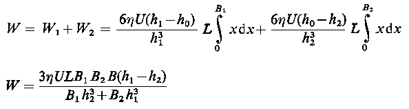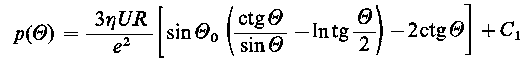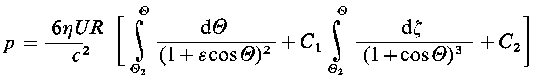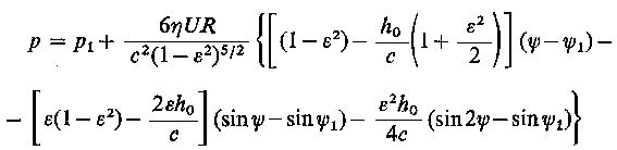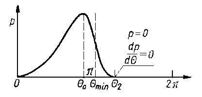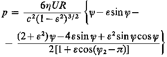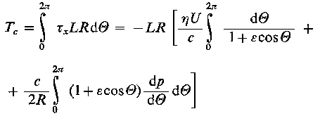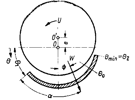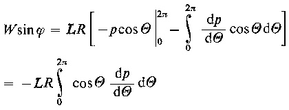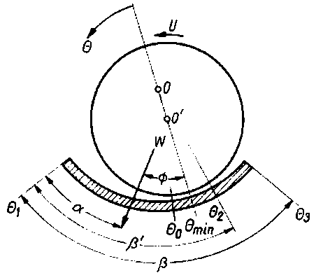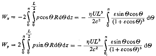 Drugi składnik prawej strony równania (6.153) całkowany jest w granicach od 0 do Z,. W zasadzie jest to nieprawdziwe, ponieważ począwszy od punktu E, a więc od punktu θ2, następuje rozdzielenie warstewki cieczy. Na skutek tego łożysko nie jest pokryte smarem na całej swojej długości L, lecz tylko na długości L' < L. Długość L łatwo można obliczyć ponieważ począwszy od θ2 gradient ciśnienia jest równy zeru, nie występują więc upływy boczne.