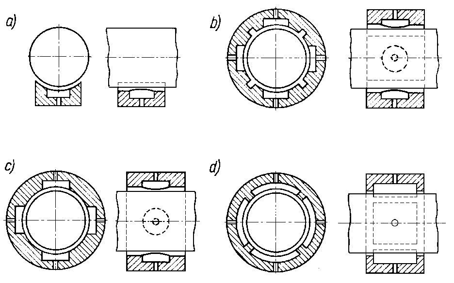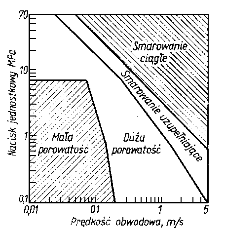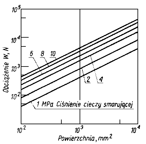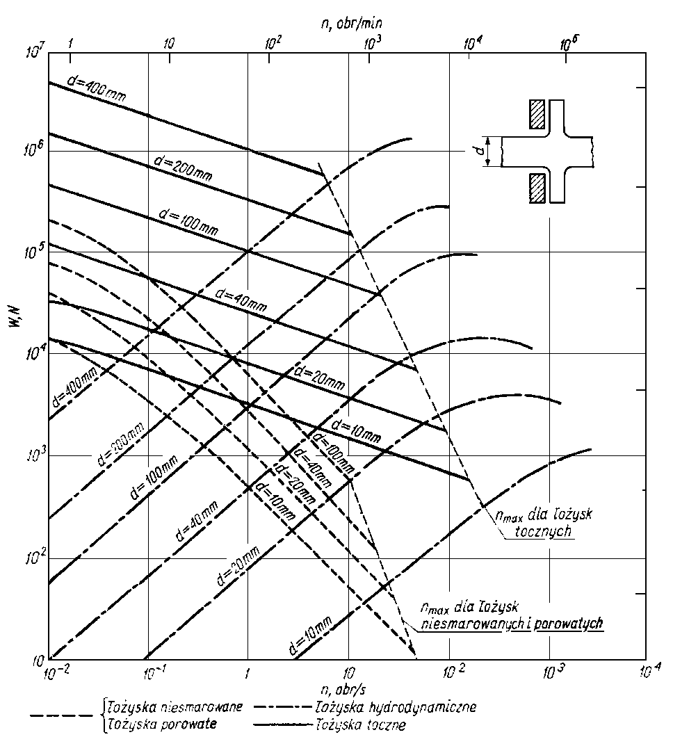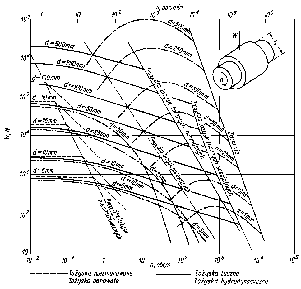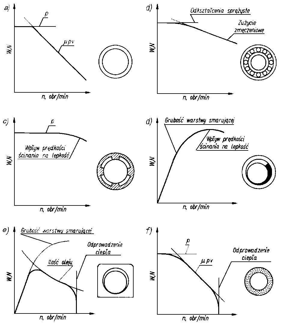 W celu zorientowania w tendencjach zmian wartości podstawowych parametrów pracy łożyska przedstawiono na rys. 6.47 w skali logarytmicznej modelowo zależności obciążenia od prędkości obrotowej sześciu rodzajów łożysk: