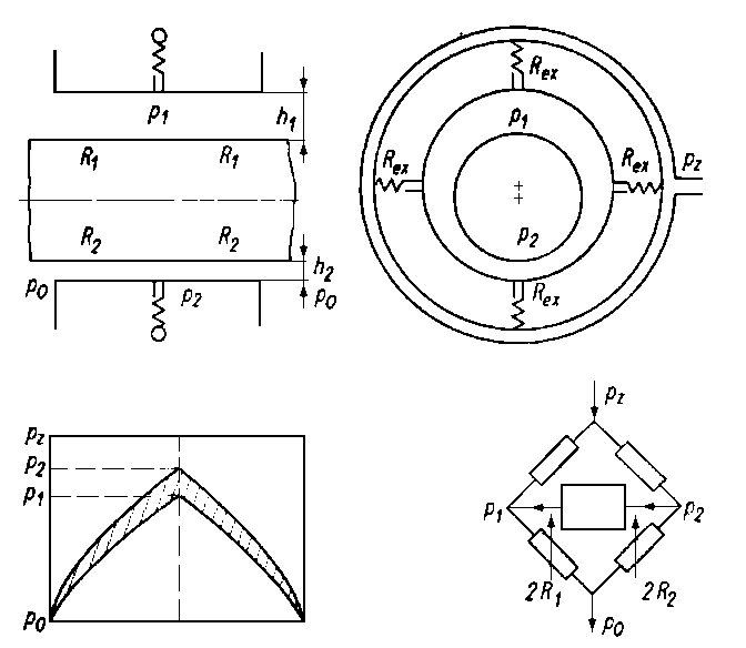 Innym interesującym analogiem smarowania hydrodynamicznego jest sieć elektryczna prądu stałego. Element takiej sieci jest przedstawiony na rys. 6.461 Ciśnienie jest tu symulowane przez napięcie i natężenie przepływu cieczy przez prąd. Opór przepływu jest reprezentowany przez oporniki. Stosując do węzła prawo Kirchhoffa otrzymuje się