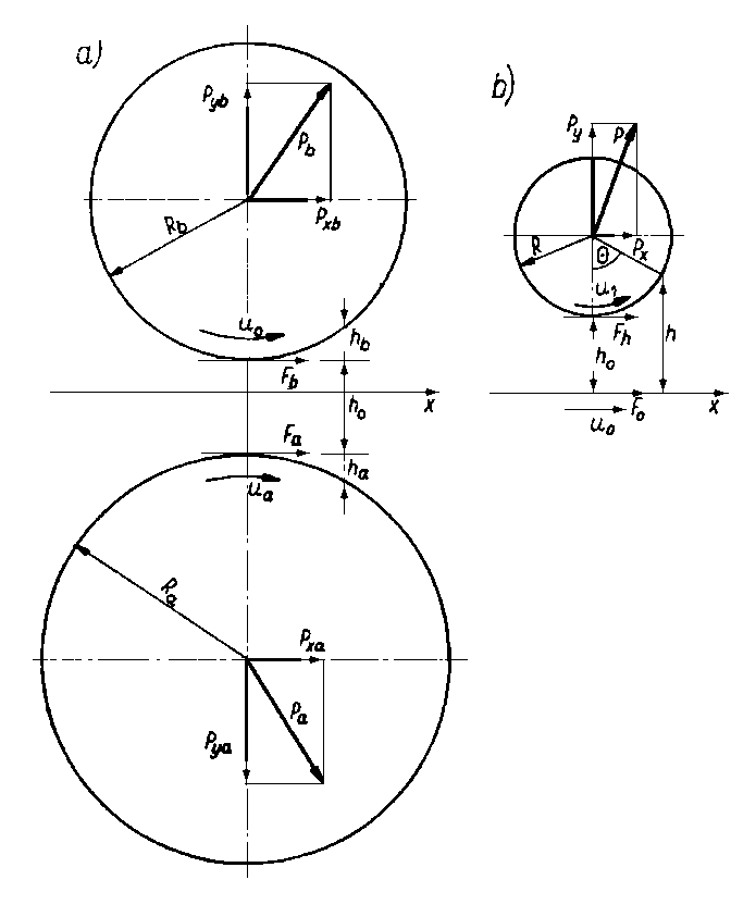 Przykładem zastosowania teorii elastohydrodynamicznej do rzeczywistych elementów maszyn może być smarowanie przekładni zębatej walcowej z zębami prostymi o zarysie ewolwentowym. Wnioski z analizy smarowania takiej przekładni przenoszą się po niewielkich modyfikacjach na inne rodzaje przekładni. Analizę tę można uznać za reprezentatywną dla większości przekładni zębatych. Uwzględnienie kinematyki i dynamiki przekładni zębatej w analizie smarowania elastohydrodynamicznego jest zagadnieniem skomplikowanym. Praca przekładni składa się z kolejno po sobie następujących cykli przyporu (zazębiania i wyzębiania). W czasie każdego z cykli następuje zmiana wartości i kierunku siły stycznej, wartości i kierunku prędkości oraz promieni krzywizny w punkcie przyporu. Dlatego teoria określona dla stanu ustalonego nie uwzględnia wszystkich czynników charakteryzujących przebieg procesu smarowania w czasie. Przyjęcie promieni krzywizny stykających się powierzchni oraz ich transformacja na dwa cylindry, a następnie na cylinder i płaszczyznę, odwzorowuje jedynie jeden wybrany punkt przyporu. Podobne ograniczenie dotyczy także prędkości i obciążenia. Z powyższych przyczyn pełna analiza powinna uwzględniać zmiany, jakim podlega warstwa elastohydrodynamiczna wzdłuż odcinka przyporu. Zgodnie z rys. 6.91 odległość pomiędzy osiami kół zębatych wynosi