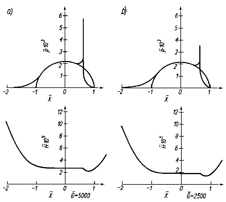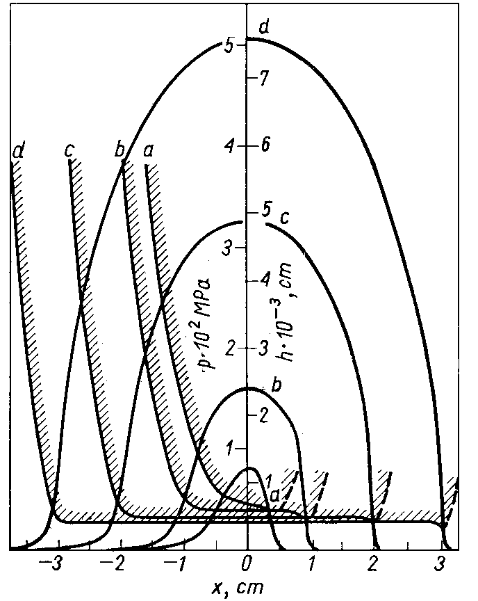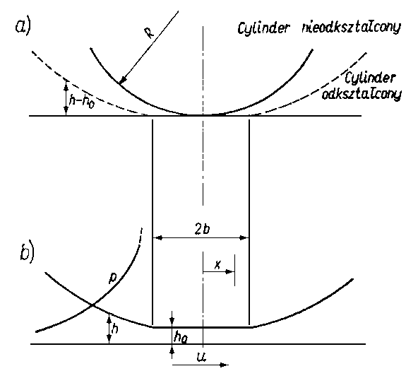 Rys. 6.105. Wpływ ściśliwości cieczy smarującej na kształt i grubość warstwy elastohydrodynamicznej;