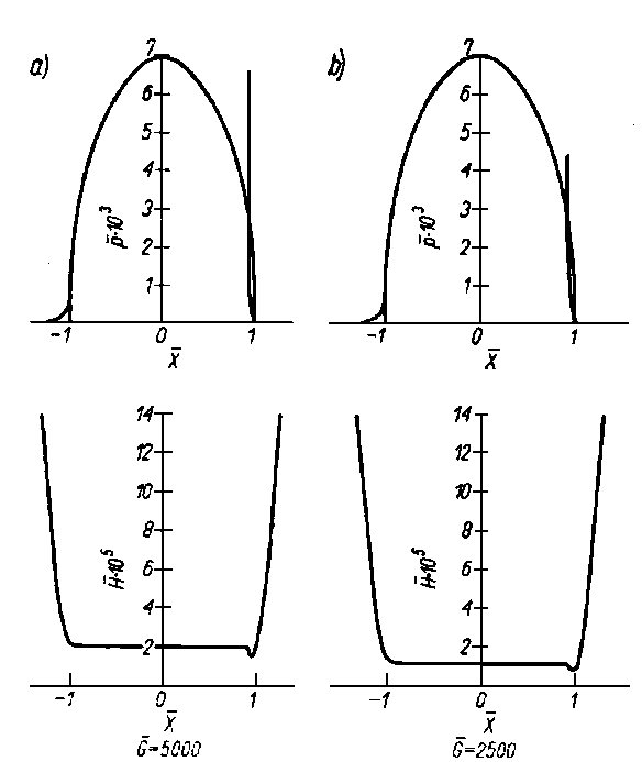 Rys. 6.104. Wpływ parametru prędkości U = na rozkład ciśnienia w elastohydrodynamicznej warstwie cieczy ściśliwej, przy W = 3•10 -5, G = 5000,